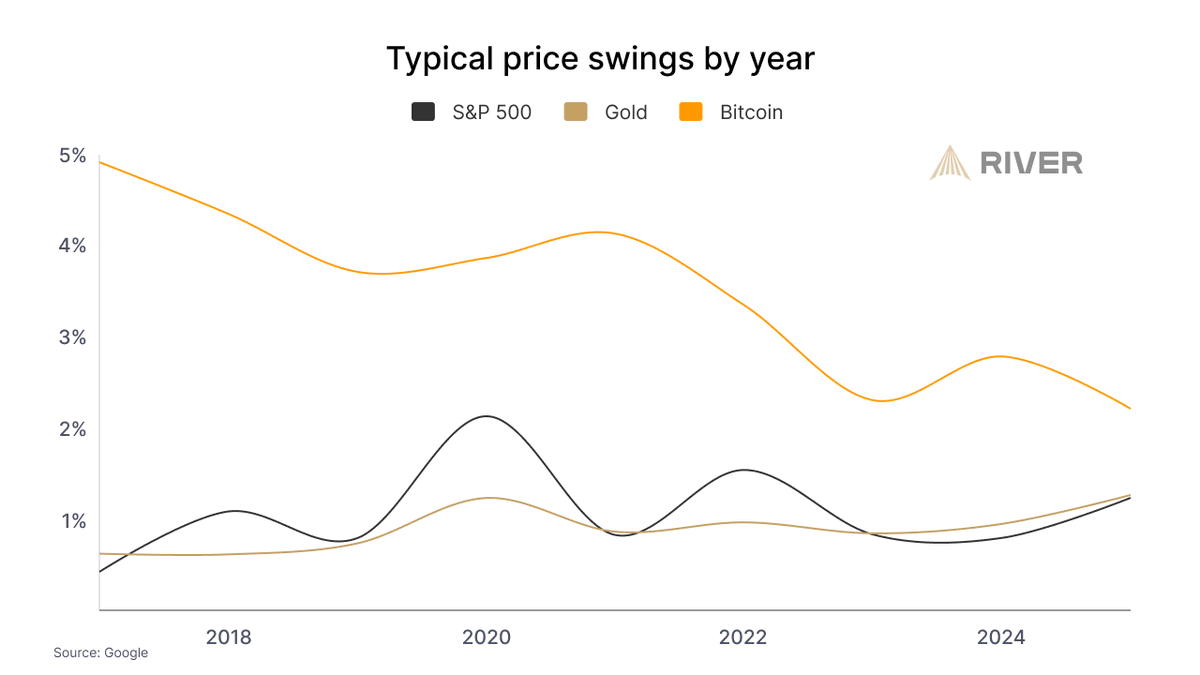 Esto indica que bitcoin se percibe cada vez más como una clase de activo madura. A medida que la volatilidad disminuye, la barrera para inversores más adversos al riesgo se reduce.