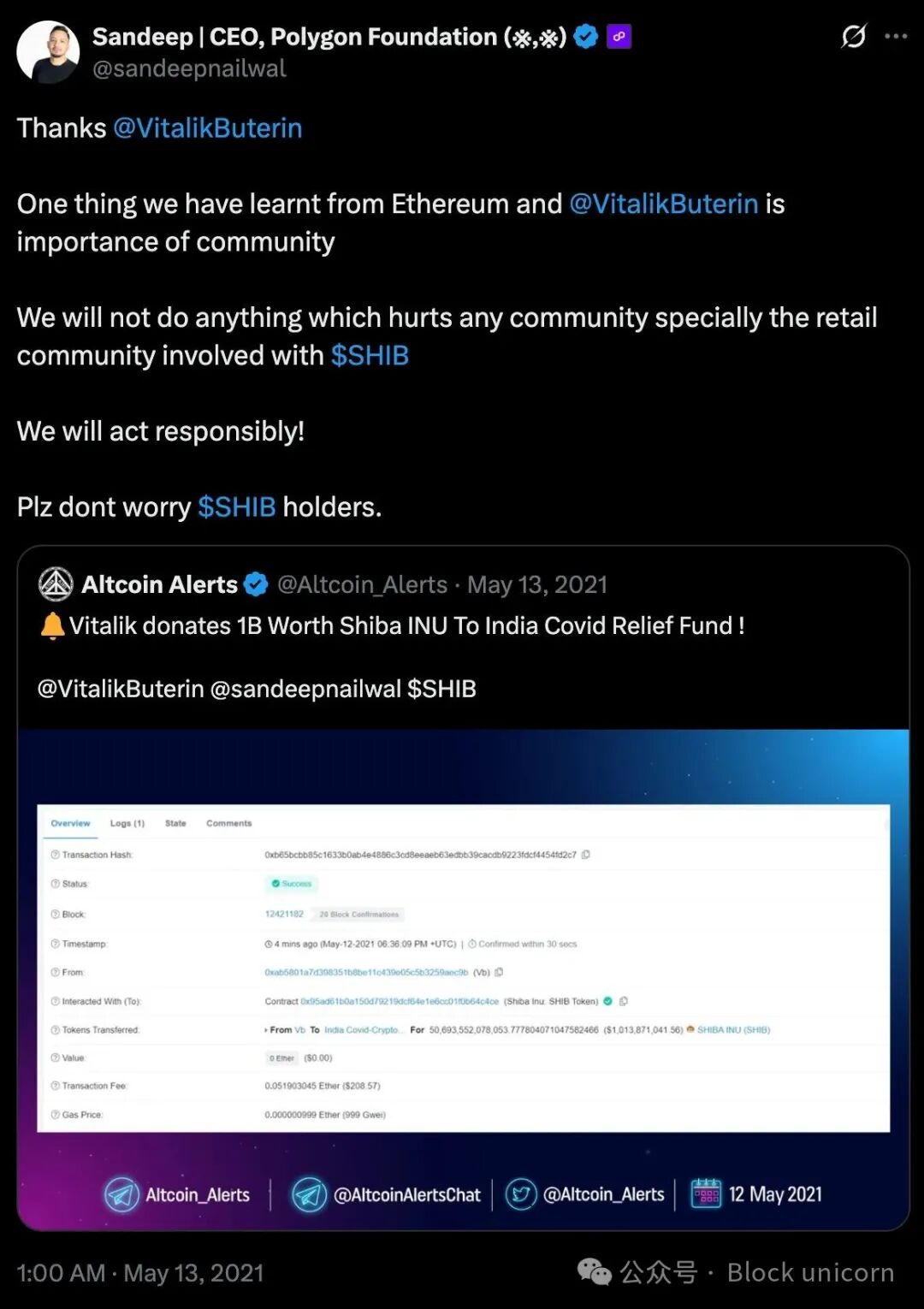 Él expresó en Twitter que no podía permanecer indiferente ante esta crisis. Creó una billetera de múltiples firmas en criptomonedas para recibir donaciones, esperando recaudar un total de 5 millones de dólares. En pocos días, las donaciones alcanzaron los 10 millones de dólares. Luego, Vitalik Buterin, el fundador de Ethereum, donó Shiba Inu por un valor de 1 mil millones de dólares.