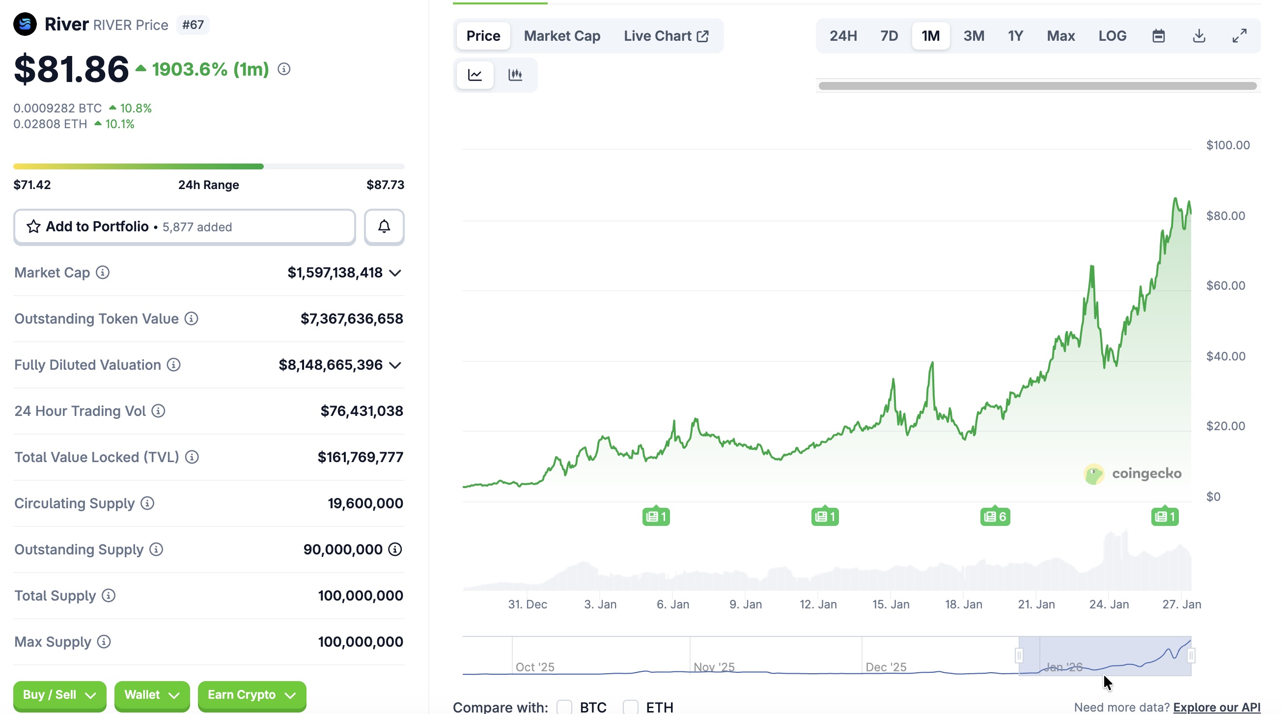 RIVER es el token nativo de una plataforma de abstracción de stablecoins multichain del mismo nombre. A finales de diciembre, este token cotizaba alrededor de 5 USD, pero luego experimentó una fuerte subida, y recientemente se negocia en torno a 82 USD. Con el precio registrado el lunes, la capitalización de mercado de RIVER alcanza aproximadamente 1,6 mil millones de USD, situándose en la posición 67 del mercado crypto.