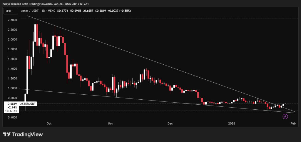 La acción del precio se enfrió drásticamente después de ese primer impulso, pero el interés nunca desapareció por completo. Los niveles de precio actuales alrededor de $0.65 han reabierto la conversación, especialmente para quienes preguntan cómo podría verse hoy $1,000 en ASTER para 2027.