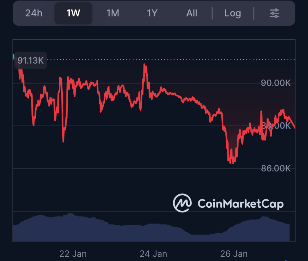 El precio de Bitcoin se debilitó notablemente la semana pasada, cayendo desde alrededor de $91,130 el 21 de enero hasta aproximadamente $87,876 el 27 de enero, reflejando una caída semanal del 4%. Lamentablemente, los traders que esperaban una consolidación cerca de los $90,000 vieron frustradas sus expectativas.