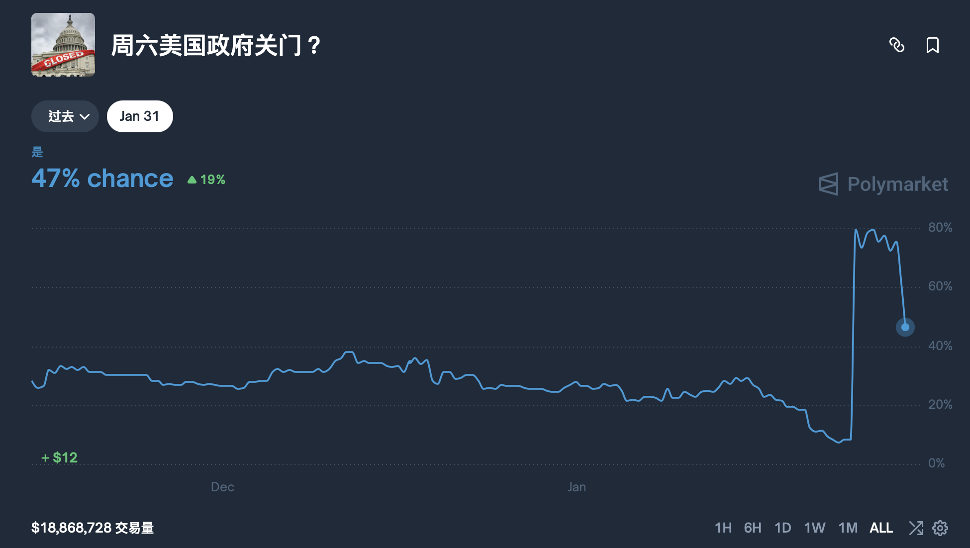 Mientras los medios tradicionales siguen reportando acusaciones mutuas entre los partidos, el mercado de predicciones en cadena ya ha dado la respuesta más honesta. Según datos de Polymarket, la probabilidad de un cierre del gobierno de EE. UU. el sábado, que ayer alcanzaba un angustiante 80%, se desplomó en cuestión de horas, quedando en aproximadamente 47%, con una caída del 33% en un solo día. Este tipo de caída vertical suele ocurrir solo cuando hay filtraciones de información privilegiada.