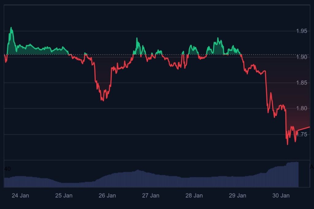 La predicción del precio de XRP ha sido bastante incierta, con el token luchando por mantener las ganancias iniciales en la última semana de enero de 2026. El precio de XRP cayó de $1.90 el 24 de enero a aproximadamente $1.75 para el 30 de enero, ya que la presión de venta se intensificó en todo el mercado de criptomonedas. Esta caída del 8% en la semana refleja un sentimiento de aversión al riesgo más amplio, impulsado por la debilidad de Bitcoin, con niveles técnicos que no lograron sostenerse.