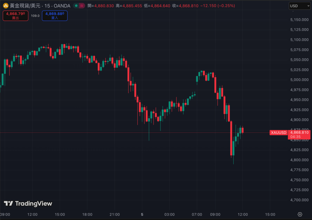 ¿Creías que los metales preciosos habían rebotado? Pues el mercado volvió a darles una lección a todos los que intentaron comprar en el fondo. A las 9 de la mañana, hora de Taiwán (5), el oro spot todavía se mantenía en 5,006 dólares. Dos horas después, el precio cayó por debajo de los 4,800 dólares, con una caída superior al 4%. La plata fue aún más severa, cayendo desde 89.5 dólares hasta perforar los 74 dólares, con una caída cercana al 17%.
