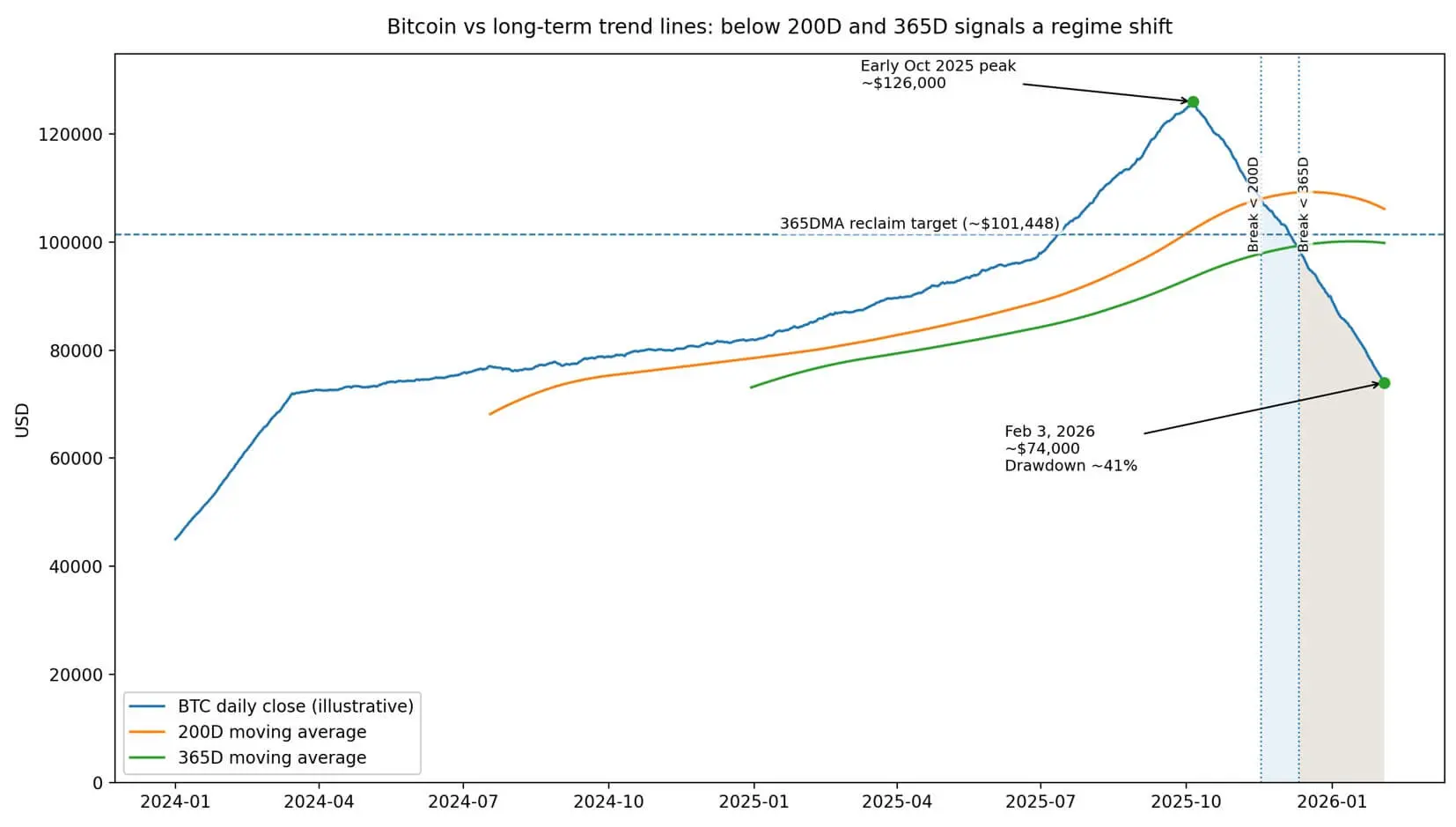 Desde su pico por encima de 126,000 USD a principios de octubre de 2025, BTC ha caído aproximadamente un 41%, situándose alrededor de 74,000 USD hasta el 3 de febrero de 2026.