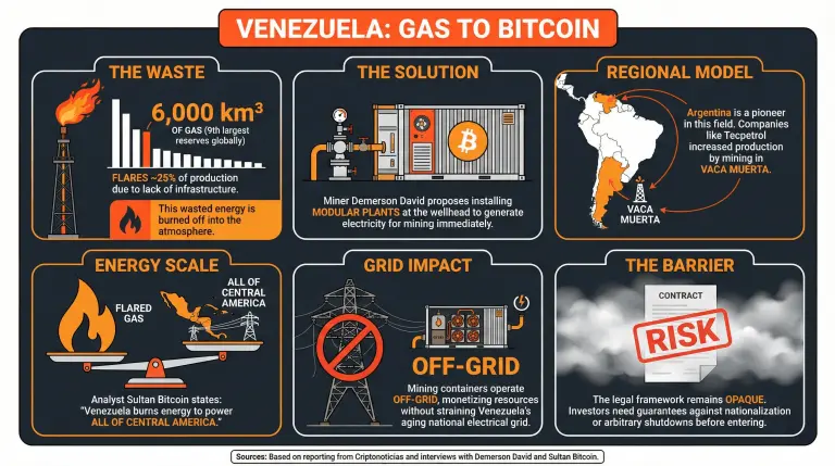 Sultan Bitcoin, un analista de bitcoin venezolano, afirmó que Venezuela quema energía para alimentar toda Centroamérica, y que la minería de bitcoin podría ofrecer una forma de monetizar estos recursos mientras se construye infraestructura para procesar y transportar este gas.