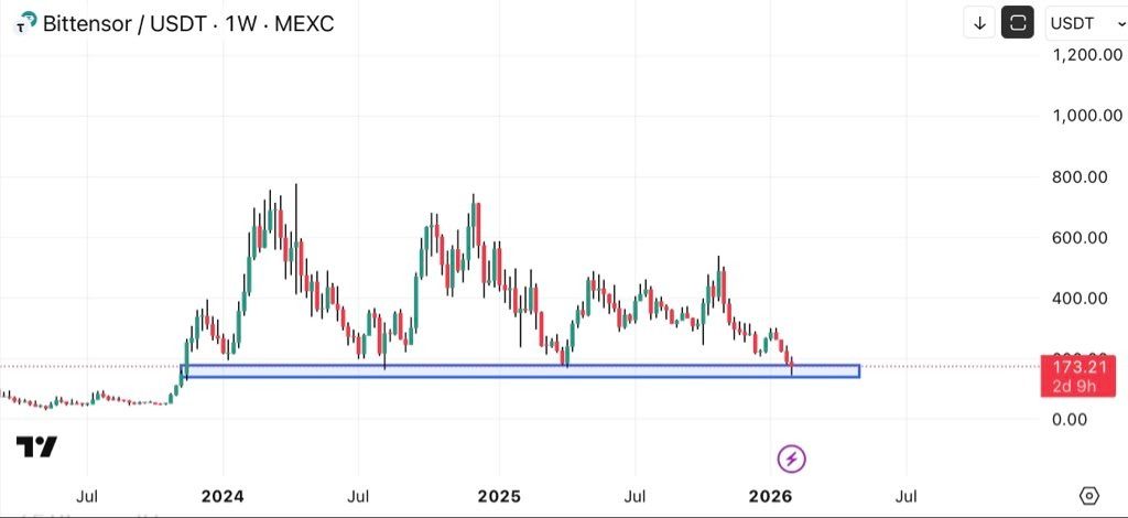 El analista Lyvo lo resumió bastante claramente: el precio de TAO se encuentra alrededor del rango de soporte semanal de $160–$180. Si los compradores intervienen y lo defienden, el gráfico tiene espacio para invertir la tendencia. Si rompe, la bajada puede acelerarse rápidamente, y probablemente no será un movimiento lento.