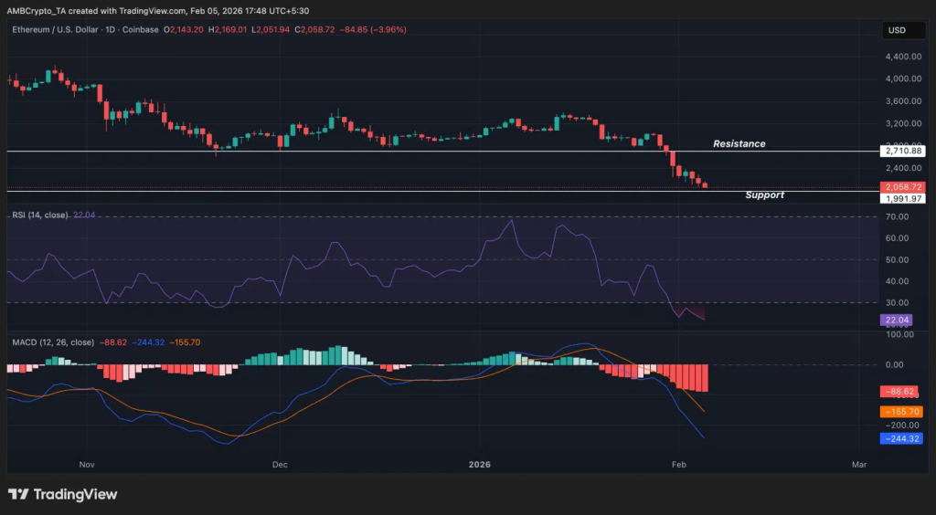 Las señales técnicas muestran una posible zona de fondo alrededor de $2K a $2.1K, ya que el activo entra en territorio sobrevendido. Si más compradores siguen esta tendencia, ETH podría ver un rebote constante desde los mínimos recientes.