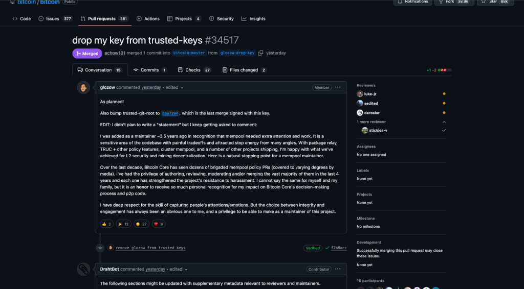 Envió su última solicitud de extracción al repositorio de Bitcoin en GitHub, eliminando su clave PGP de las claves confiables y retirándose del pequeño círculo de mantenedores capaces de actualizar el software de Bitcoin. Aunque esto demuestra la resiliencia descentralizada de Bitcoin, también resalta la madurez del activo.