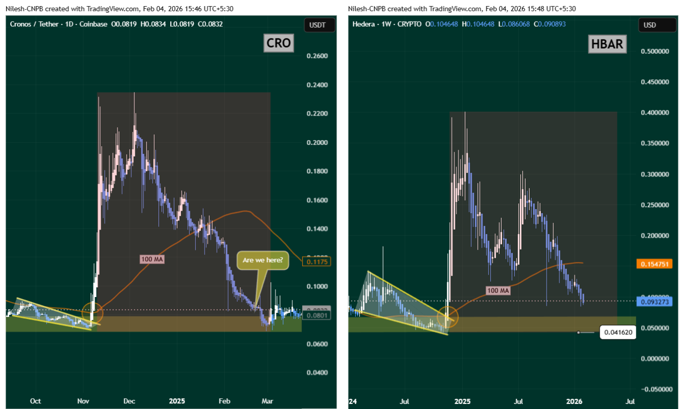 Tras su propio rompimiento de cuña descendente y rally, Hedera entró en una corrección pronunciada. Desde entonces, el precio ha perdido la media móvil de 100 semanas y ahora está presionando en la zona de soporte de $0.084, alineándose estrechamente con la última fase de corrección de CRO antes de su caída más profunda.