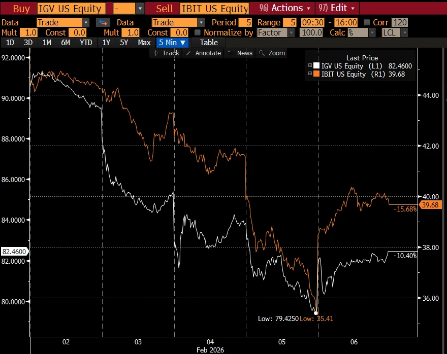 Primero, esta ronda de venta de Bitcoin probablemente tocó algún tipo de cartera o estrategia de inversión multiactivos que no es puramente nativa de criptomonedas. Esto puede ser tanto los fondos multiestrategia mencionados anteriormente, como también carteras modelo similares a las de BlackRock, que configuran entre IBIT y IGV (ETF de software), y que en medio de la volatilidad se ven forzados a reequilibrar automáticamente sus posiciones.