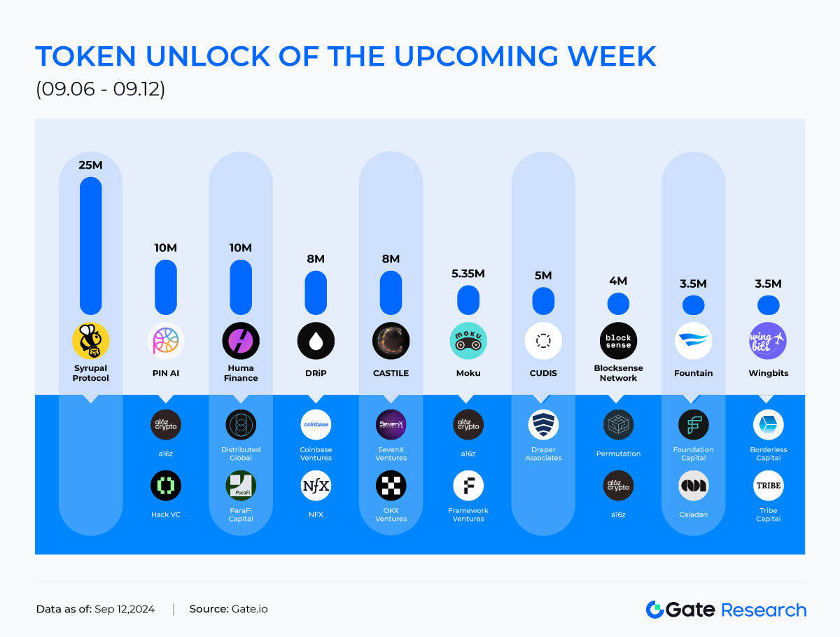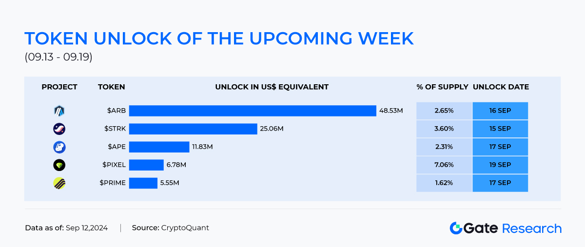 Según los datos de Token Unlocks, la próxima semana (13-19 de septiembre de 2024), habrá varios eventos importantes de desbloqueo de tokens en el mercado. La mayoría de los desbloqueos de tokens son superiores a los diez millones de dólares, con un total de 109 billones de dólares desbloqueados. Aquí se presentan las primeras 3 situaciones de desbloqueo de esta semana: