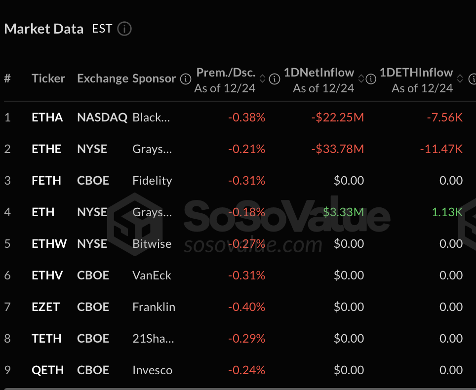 Los ETF spot de Ethereum siguieron un patrón similar, con $52.70 millones en salidas netas totales. Los productos respaldados por Grayscale representaron la mayor parte de la presión vendedora, mientras que la mayoría de los demás ETF de Ethereum registraron flujos diarios planos o neutrales.