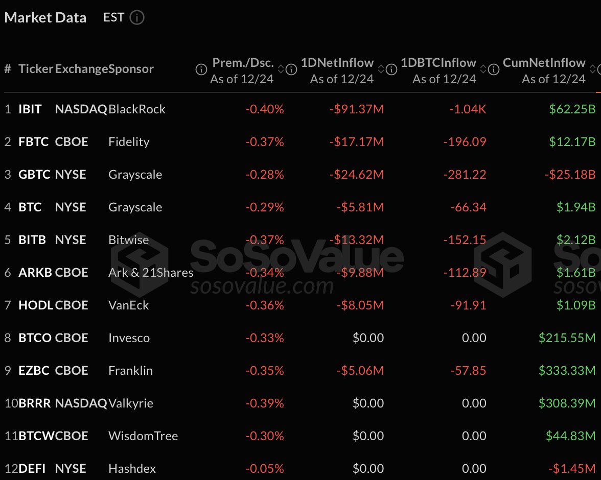 Los ETF spot de Bitcoin registraron $175 millones en salidas netas totales el día, marcando una de las retiradas de un solo día más grandes a finales de año. El retroceso estuvo impulsado principalmente por IBIT, el ETF spot de Bitcoin de BlackRock, que reportó $91.37 millones en salidas netas: la mayor caída entre todos los productos de ETF de Bitcoin.