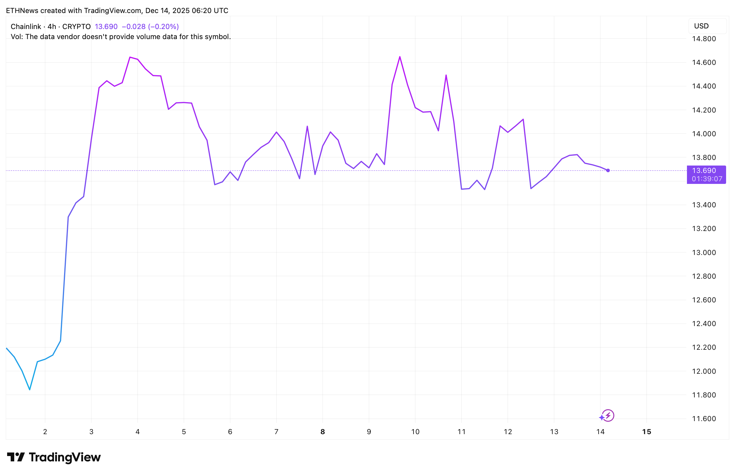 Sin embargo, el contexto más amplio aún exige cautela. Mientras LINK siga cotizando por debajo de sus grupos centrales de resistencia, la recuperación sigue siendo técnicamente frágil. Esto se refleja en el gráfico de 4 horas, donde los datos de ETHNews muestran que el precio se mantiene alrededor de $13.69, con múltiples intentos de estabilizarse, pero sin una ruptura decisiva.