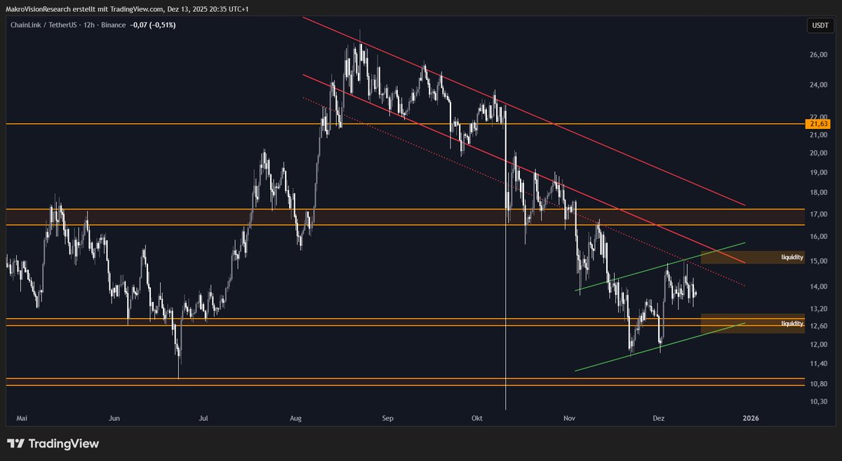 Este movimiento podría sentar las bases para una recuperación más amplia, pero hasta que se recupere ese nivel, LINK permanece en una fase neutral a ligeramente defensiva. Esto coincide con el gráfico de marcos de tiempo más altos compartido por MakroVision, donde Chainlink continúa cotizando por debajo de un canal descendente formado durante la segunda mitad de 2025.