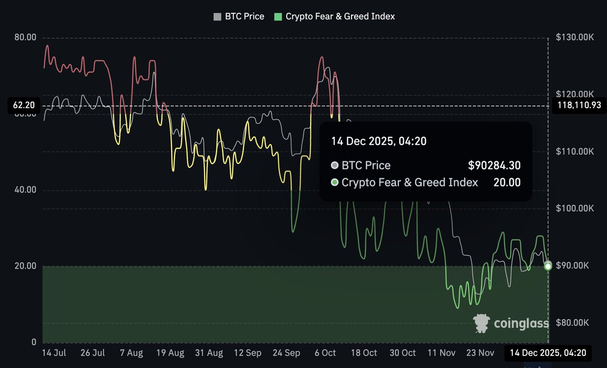 Mientras BTC continúa operando cerca del nivel de $90,000, el Crypto Fear and Greed Index ha caído con fuerza hasta 20, situando al mercado firmemente en la zona de “miedo”. Esta divergencia sugiere que la confianza se ha deteriorado más rápido que el precio.