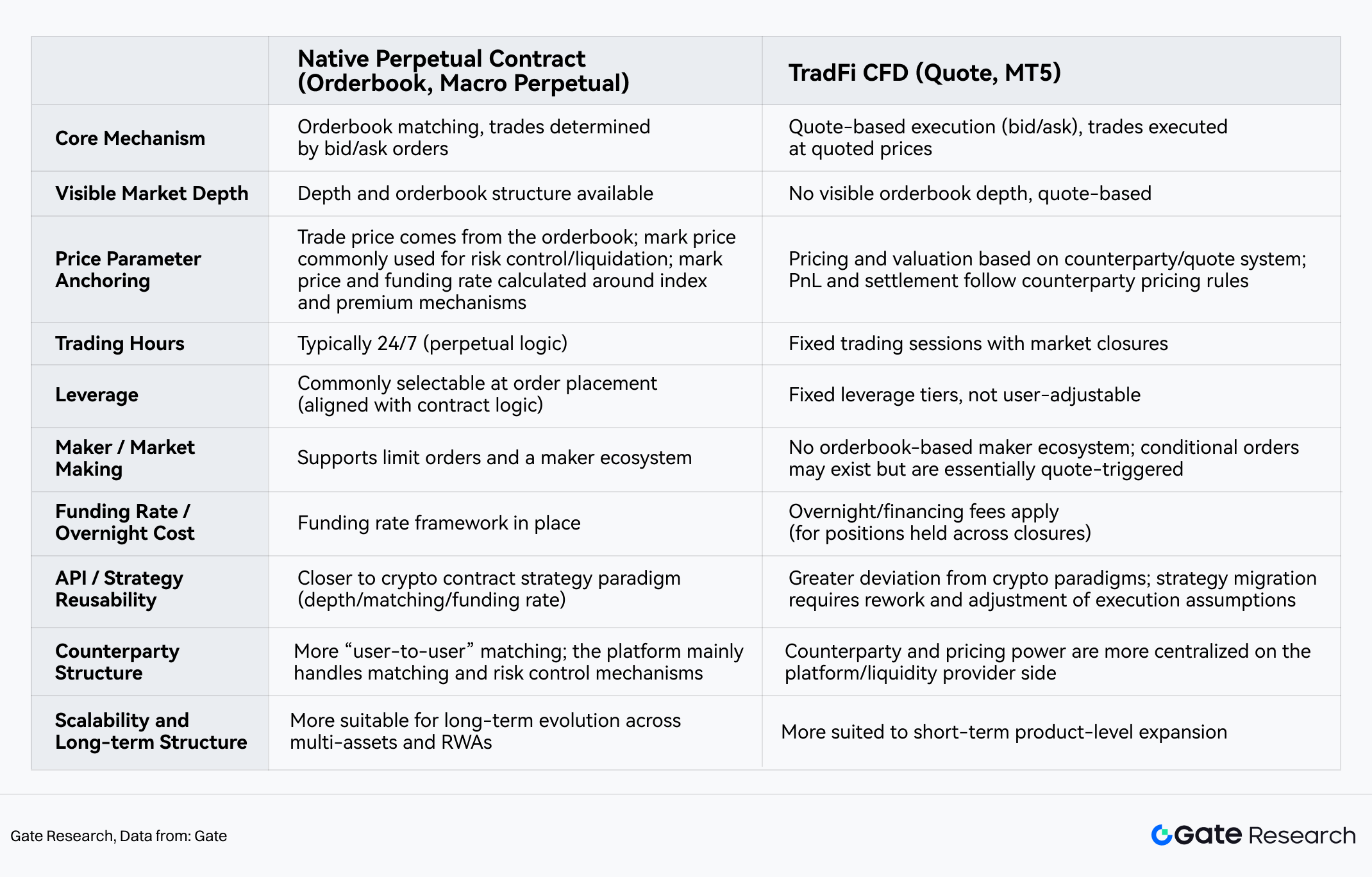 L’approche dominante consiste à intégrer les actifs traditionnels dans des systèmes CFD indépendants, la variété d’actifs et les faibles seuils d’entrée étant les principaux avantages concurrentiels. Gate a choisi une voie axée sur l’évolution de l’infrastructure sous-jacente — intégrant directement les actifs TradFi dans un système perpétuel unifié par carnet d’ordres. Cela garantit la cohérence avec les contrats natifs crypto en matière de formation des prix, structure de carnet d’ordres, logique d’appariement et comportement API. Gate ne se contente pas d’étendre son offre de produits TradFi au sens classique, mais construit une infrastructure de matching multi-actifs unifiée pour le trading de dérivés.