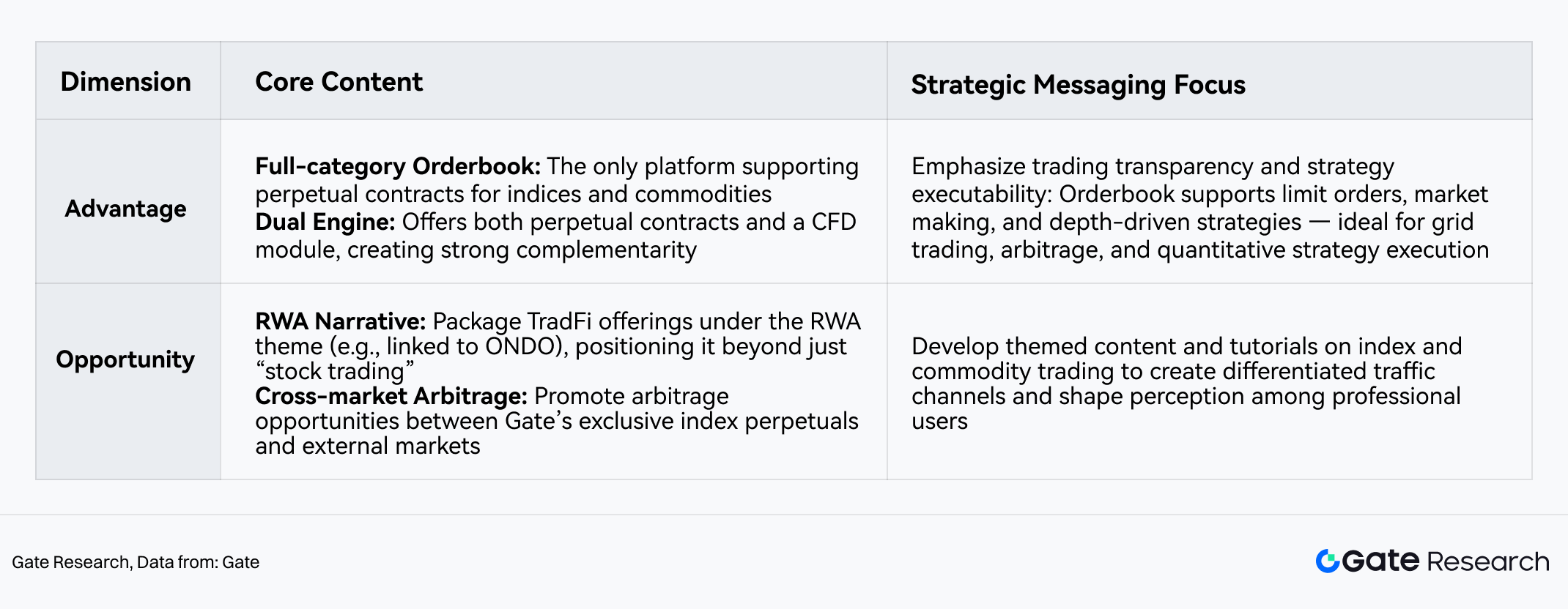 Il est recommandé que Gate fasse évoluer son discours stratégique externe de « expansion d’actifs TradFi » vers « montée en gamme de l’infrastructure de trading multi-actifs ». Le récit central devrait s’articuler autour des axes suivants :