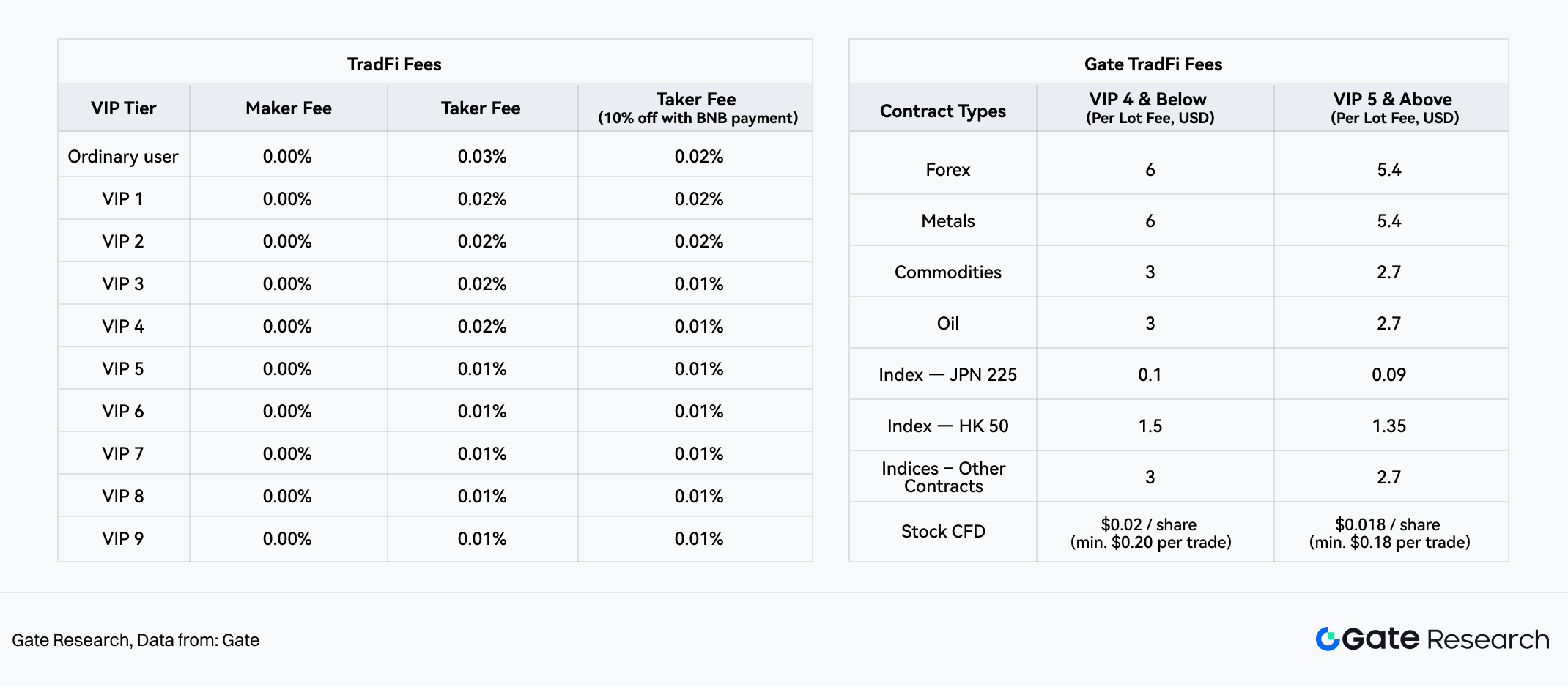 Pour les produits TradFi, Gate et B** ont adopté des modèles de tarification différents. Gate maintient une tarification fixe par lot, courante sur les marchés CFD traditionnels, tandis que les Perps TradFi de B** suivent un modèle de contrat perpétuel avec frais proportionnels au volume notionnel.