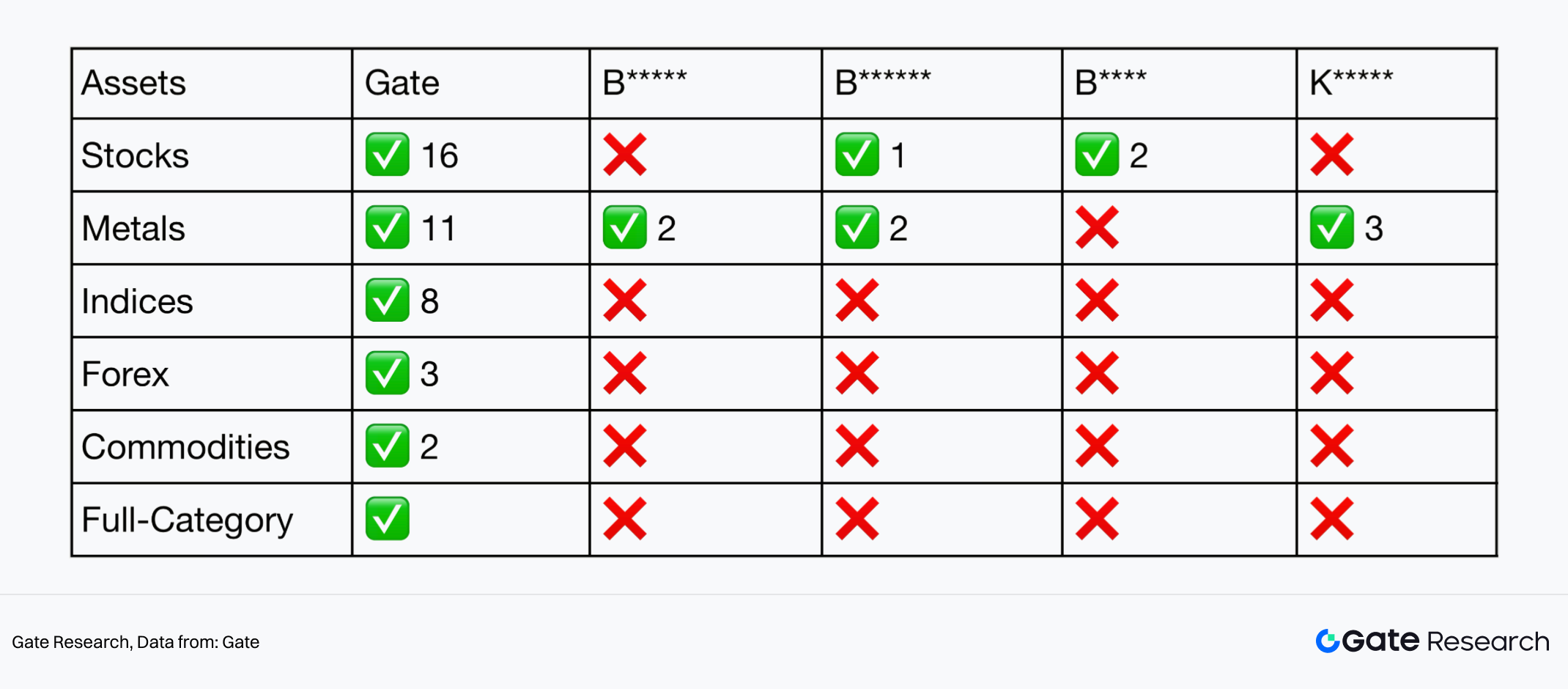 Du point de vue de la matrice de couverture, Gate occupe une position de leader très nette dans la couverture des actifs traditionnels par carnet d’ordres. Gate est actuellement la seule plateforme à proposer une couverture complète par carnet d’ordres, permettant de trader actions, métaux, indices, forex et matières premières sous un système unifié. Gate est aussi la seule plateforme à avoir réellement intégré indices et matières premières dans le carnet d’ordres.