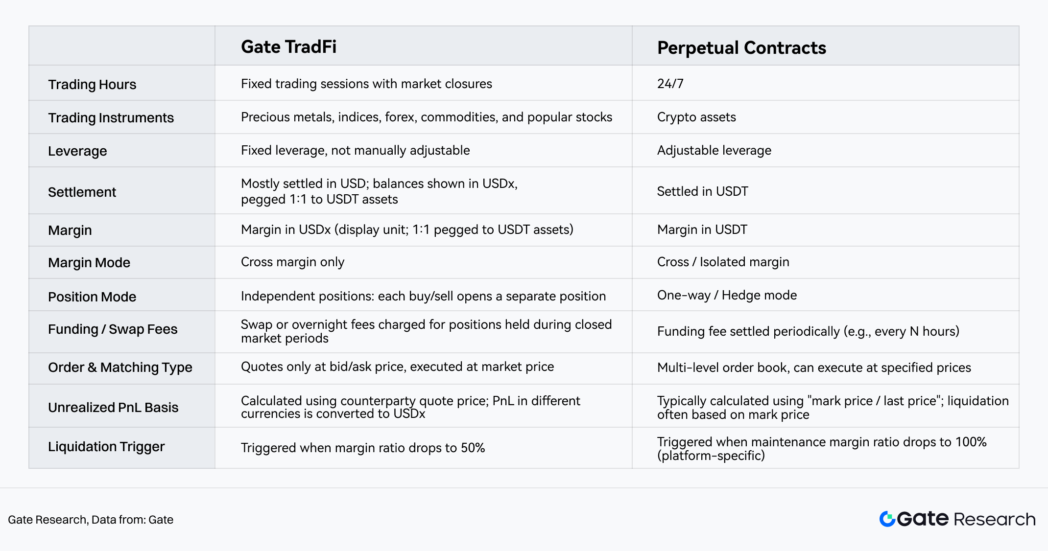 Gate TradFi se distingue nettement des contrats perpétuels standards sur plusieurs points clés : horaires de trading, effet de levier, marge et couverture, exécution et calcul du profit & perte.