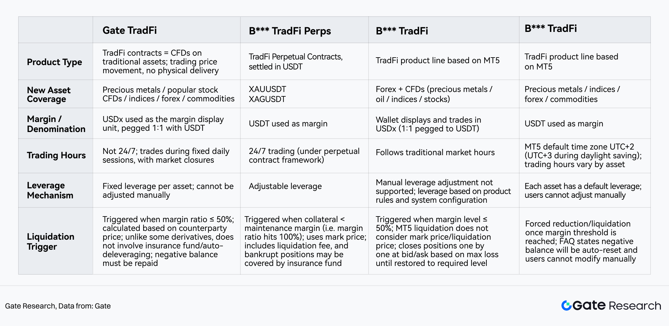 Globalement, Gate TradFi adopte l’approche MT5 + CFD classique. Il propose le trading sur prix des instruments TradFi et intègre MT5 à son système de comptes, faisant du trading multi-actifs une capacité professionnelle durable et réutilisable. À l’inverse, certains modèles TradFi n’intègrent qu’un nombre limité d’actifs dans le cadre des contrats perpétuels, offrant une exposition au prix mais reposant sur des mécanismes dérivés crypto (taux de financement, prix de référence, trading 24/7). La différence réelle ne tient pas à l’inclusion d’actifs TradFi, mais à la mise en place d’un véritable système et d’un ensemble de règles TradFi. De ce point de vue, Gate TradFi se rapproche d’un desk macro intégré à un CEX.
