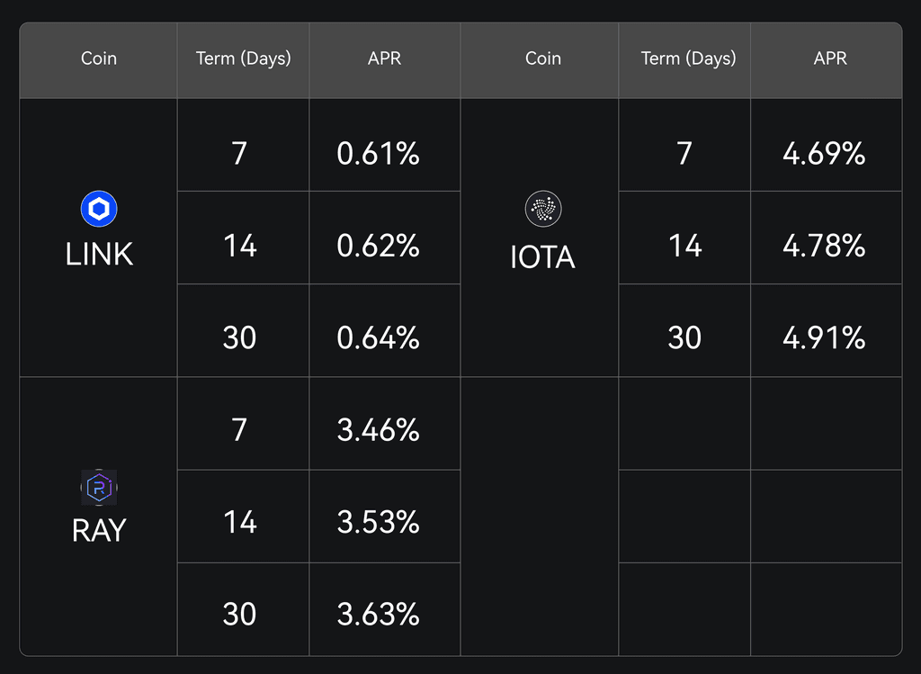 En janvier 2026, Gate YuCoin Vault inaugure une nouvelle série d'événements de gestion de patrimoine à terme fixe, mettant en avant LINK, IOTA et RAY, trois crypto-actifs de premier plan. Pendant la période de l'événement, les utilisateurs peuvent choisir parmi plusieurs durées de blocage pour souscrire, bénéficiant ainsi de rendements annualisés relativement stables tout en conservant la détention de ces tokens.