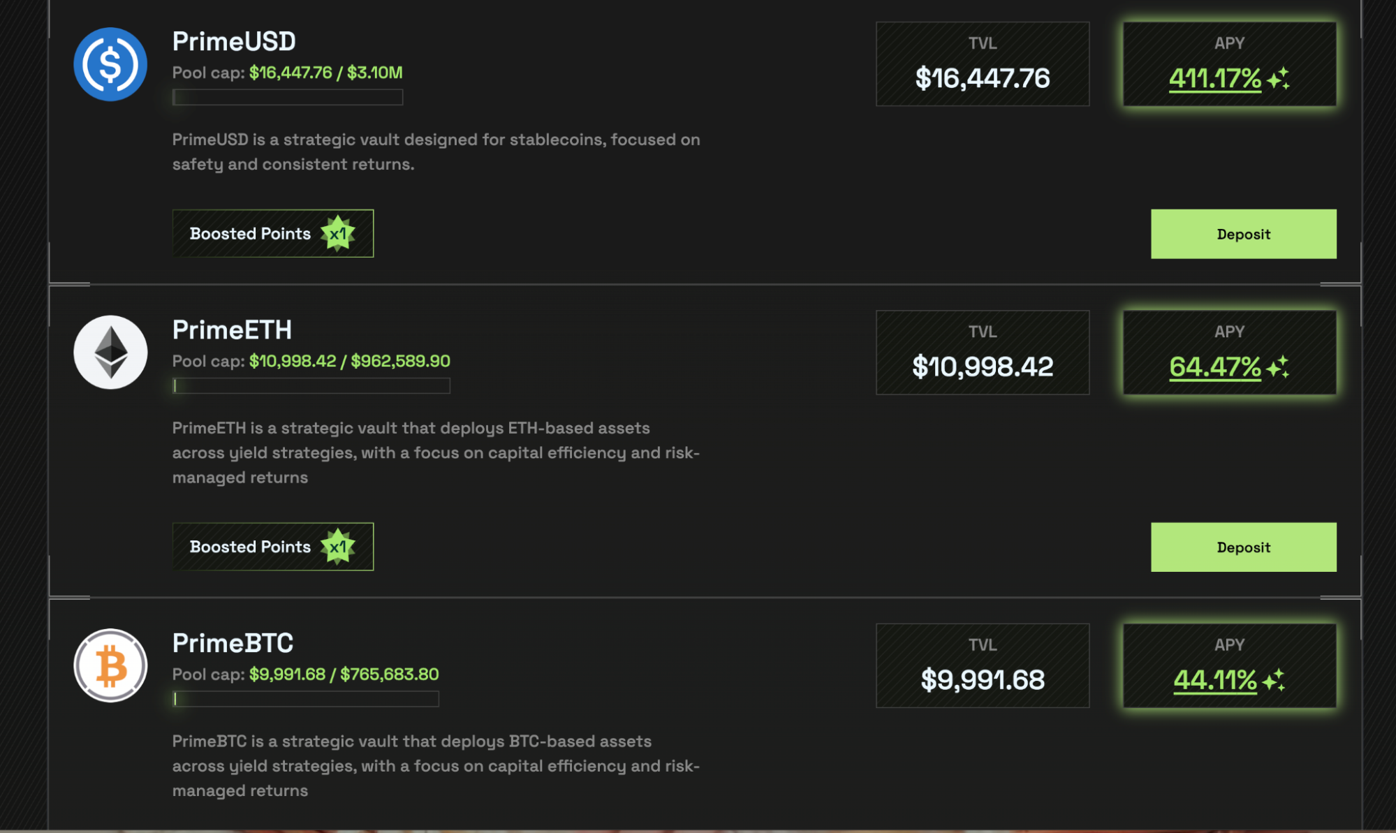 Prime Vaults ouvre sa première phase de pré-dépôt, avec des stratégies initiales déployées dans l’environnement PoL à haut rendement de Berachain. Les utilisateurs peuvent accéder à ces stratégies via Vaults sans gérer les opérations DeFi sous-jacentes. Les pools de stablecoins affichent actuellement des rendements supérieurs à 400%.