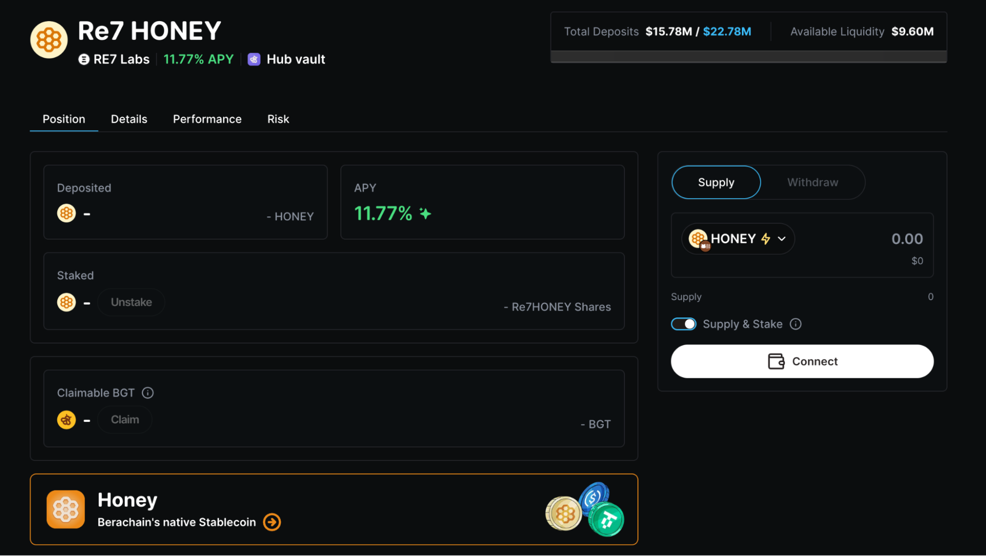 Le principal avantage du staking Honey réside dans un chemin de rendement direct et on-chain, sans structure complexe. Les dépôts et retraits sont possibles à tout moment, sans période de blocage ni plafond. Honey se positionne ainsi comme un « actif stable générateur de rendement » disponible à la demande, et non comme un produit à court terme soumis à des quotas ou à un timing précis.