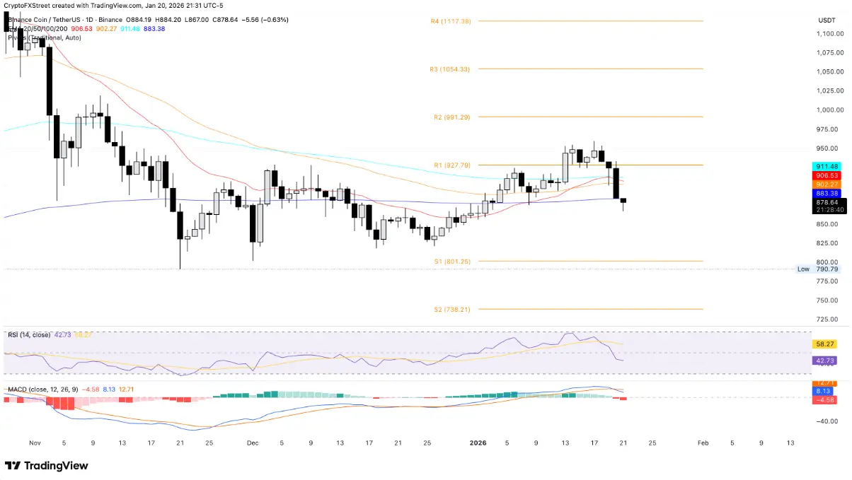 Source : CoinGlass## Perspectives techniques : Le prix du BNB peut-il tomber à 800 USD ?