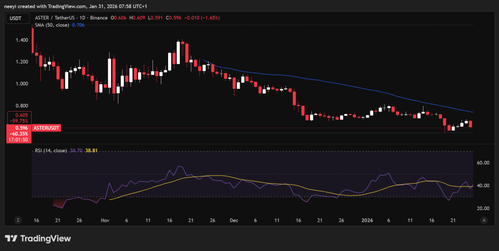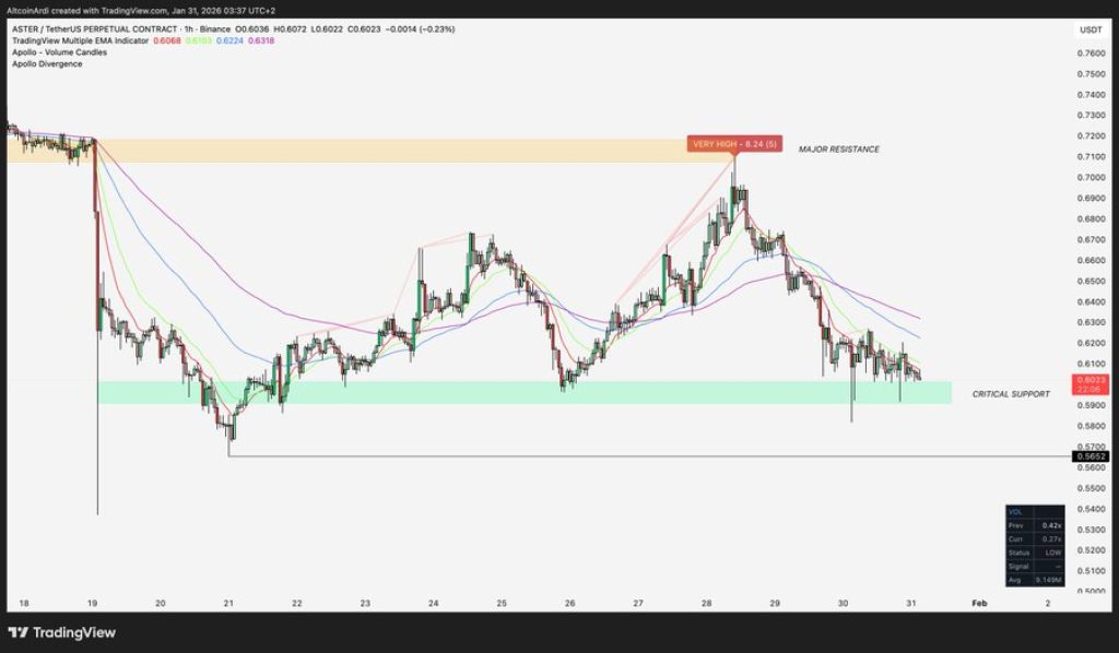 L’action des prix d’Aster ces derniers jours montre un schéma de sommets plus bas et de rebonds peu profonds. Chaque tentative de relèvement a rapidement été confrontée à une pression vendeuse, ce qui maintient la structure inclinée en faveur des vendeurs. Le support à 0,60 $ est important car les tests répétés affaiblissent la confiance, surtout lorsque les rebonds ont du mal à aller loin.