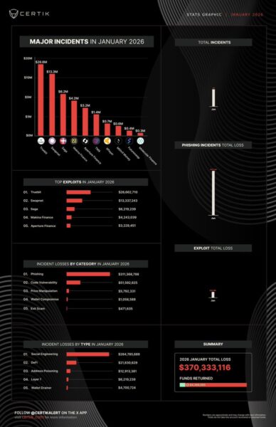 Les attaques contre la cryptomonnaie ont augmenté dans toute l’industrie, l’incident CrossCurve s’ajoutant à une liste croissante de violations. La société de sécurité CertiK a enregistré près de 400 millions de dollars de pertes en janvier 2026, avec plus de 40 incidents majeurs rapportés.