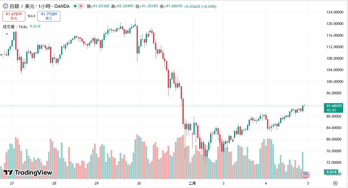 Cependant, en seulement deux jours, l’argent blanc a montré une forte capacité de rebond, le prix spot s’établissant à 91,68 dollars l’once, avec une hausse intra-journalière de plus de 7 %, témoignant d’un regain d’optimisme sur le marché.