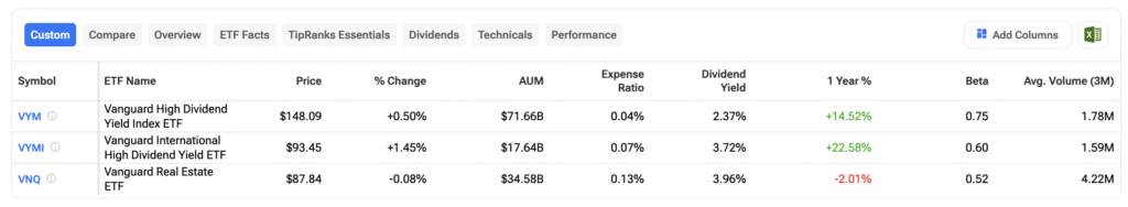 L’investissement en dividendes est une méthode simple pour générer un revenu passif stable, surtout sur les marchés volatils. Au lieu de rechercher des actions à forte croissance, de nombreux investisseurs privilégient des dividendes fiables provenant d’entreprises stables. Le groupe Vanguard est populaire pour cette approche, proposant des ETF qui offrent un revenu régulier avec un risque relativement faible. En utilisant l’outil TipRanks « Meilleurs ETF Vanguard », nous avons identifié trois options axées sur le revenu : Vanguard High Dividend Yield Index ETF VYM +0,50 % ▲, Vanguard International High Dividend Yield ETF VYMI +1,45 % ▲, et Vanguard Real Estate ETF VNQ -0,08 % ▼.