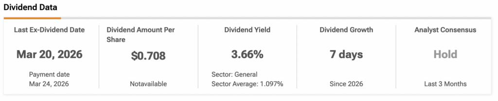 VYMI verse un dividende de 0,708 $ par action, ce qui correspond à un rendement de 3,66 %.
