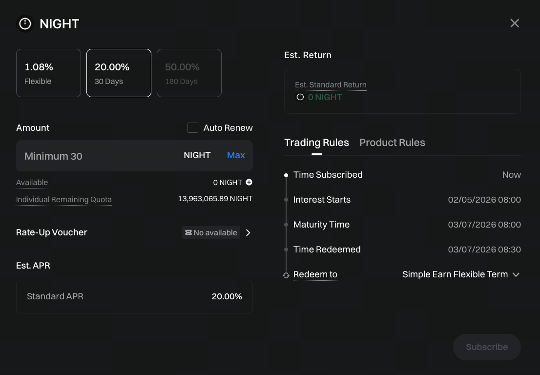 NIGHT定期運用商品は、30日間のロックアップサイクルを採用しています。申込後は満期まで資産を保有する必要があり、この期間中は途中解約できません。運用サイクル終了後、商品ルールに基づき元本と利息が分配され、利息は自動的にNIGHTトークンで付与されます。収益の詳細は[運用記録]-[定期運用]-[利息収益]でご確認いただけます。この仕組みにより、ユーザーはロックアップ期間中に予測可能なリターンを得られ、段階的な資本計画も実現できます。