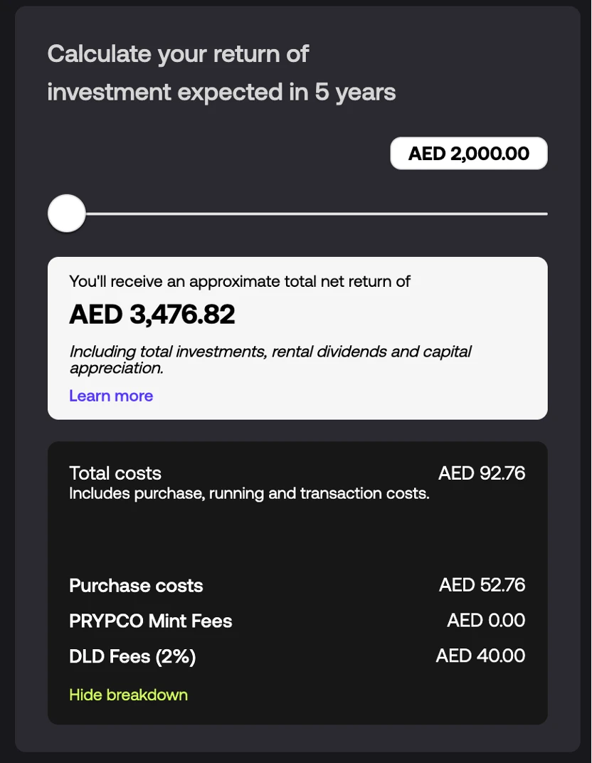 公式ウェブサイトによれば、投資家の参入レベルは**最低で2000ディルハム(約4000人民元)**に達し、5年後の予想価値は約3476.82ディルハムであり、5年間の総収益は73.84%に達する見込みです。注意が必要なのは、これは公式ウェブサイトが提供する予想であり、実際の収益を代表するものではないということです。