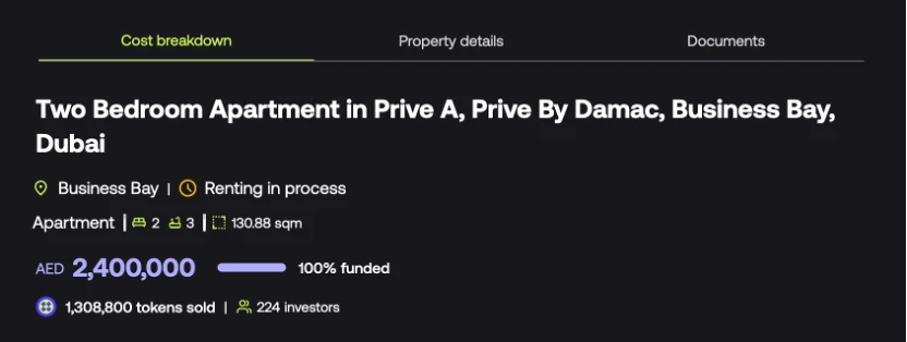 1日以内に、プロパティはPrypco Mintで100%融資され、総額はAED240万(約580万人民元)**で、合計1,308,800トークンが発行され、合計224人の投資家が参加しました。 ドバイ土地局の評価によると、ユニットの時価総額は289万ディルハムで、プラットフォームでの実際の購入価格は約16.96%低く、投資家は未実現の変動利益の20.42%に相当します。