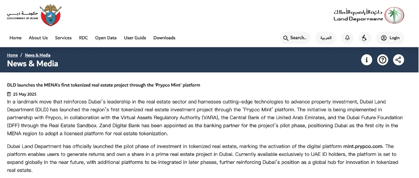 ! 地球の反対側では、「トークン化されたアパート」が1日で売り切れました2025 5月26日、ドバイランド Department, DLD)は、不動産フィンテック企業のPrypcoおよびブロックチェーンインフラストラクチャプロバイダーのCtrl Altと提携して、中東初の不動産トークン化プラットフォームである「Prypco Mint」を正式に立ち上げ、XRP Ledgerチェーン上の最初のReal World Asset(RWA)アパートメントにわずか1日で全額出資することに成功しました。 このプラットフォームは、2033年までにドバイの不動産市場の取引の約7%をオンチェーンにすることを目指すUAE政府のブロックチェーン戦略の重要な部分です。 それまでに、総資産は160億ドルに達すると予想されています。