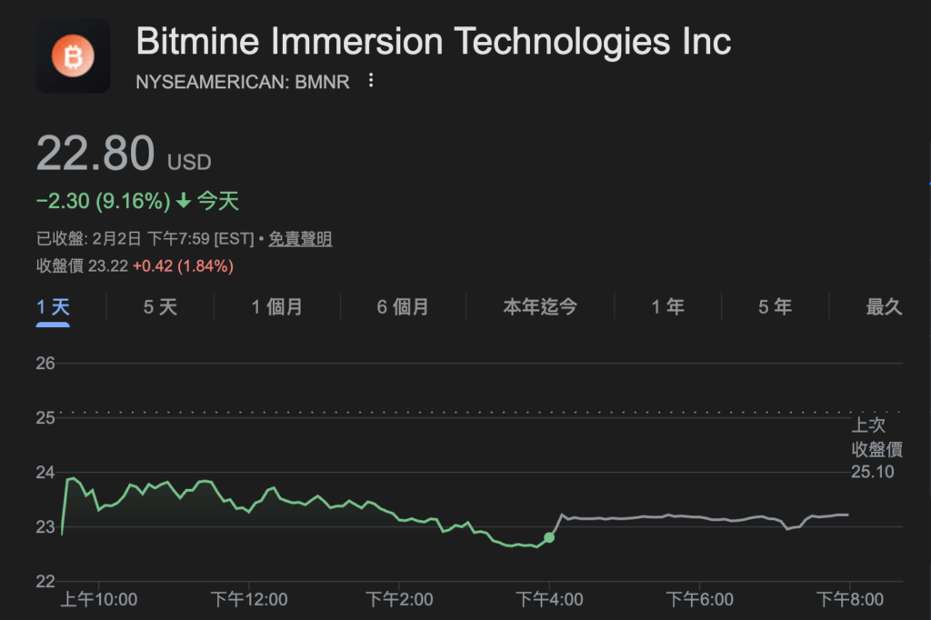 世界最大のイーサリアム保有企業であるBitmine(BMNR)は、現在428.5枚のETHを保有しており、これはイーサリアムの世界流通量の3.52%に相当します。しかし、イーサリアムの価格が2,400ドルを下回る中、Bitmineは2日に9.16%下落し、22.8ドルで取引を終え、昨年6月以来の最低値を記録しました。