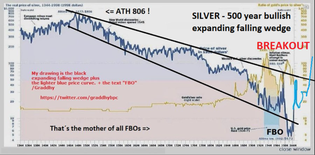 Graddhyのチャートは、500年以上前までさかのぼる銀価格を追跡しています。その期間中、銀は巨大な拡大する下降ウェッジの中を動いていました。すべての主要なラリーは失敗し、すべてのブレイクアウト試みは失速しました。金属は何世紀にもわたって下降の状態に固定されていました。