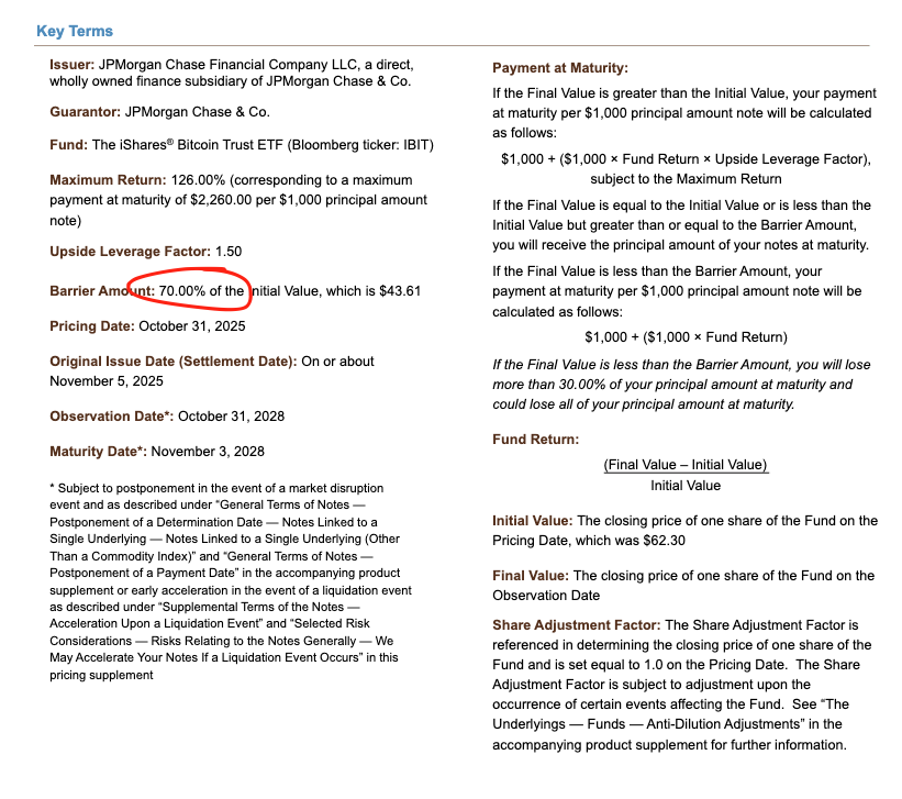 これが三つ目のリンクにつながります。 IBITが大規模なデレバレッジの中で売却される仕組みを理解した今、何が下落を加速させているのでしょうか? この火に油を注ぐかもしれない「燃料」の一つが構造化製品です。 構造化商品市場がこの売りの原因として十分に大きいとは思いませんが、すべてがVaRモデルでは予測できないほど不気味かつ完璧に重なり合った場合、それが連鎖清算のような行動を引き起こす急性の出来事になる可能性は十分にあると思います。