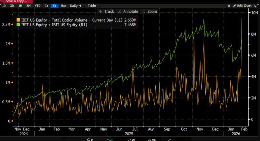 時間とともにデータが次々と明らかになるにつれて、この激しい売りはビットコインETFに関連しており、資本市場で最も悲惨な取引日の一つに起こったのです。 これはIBITが過去最高の取引量記録(1000億ドル超、以前の記録の倍)を樹立したため、これが判明しました。 この記録は非常に目を引くものであり、オプション取引量も歴史的な水準に達しています(下のチャート参照、ETF導入以来の最高契約数です)。
