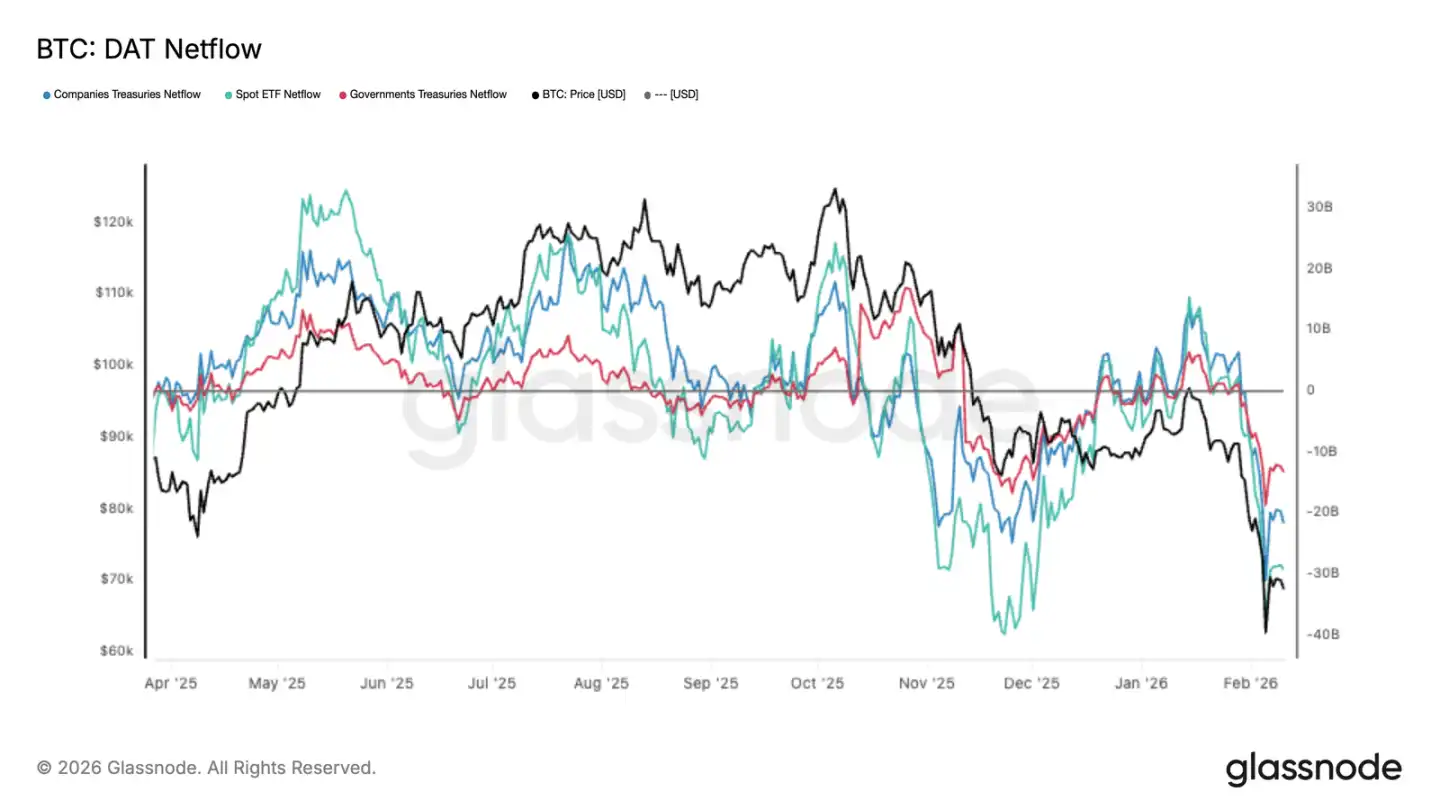 最近のデジタル資産の資金流出は顕著で、ETF、企業、政府などの機関投資家が一斉に純流出している。ビットコインも新低を記録し、ETFが主導、企業や政府も縮小傾向だ。これは特定の一部の動きではなく、市場全体のリスクエクスポージャー縮小を示す。