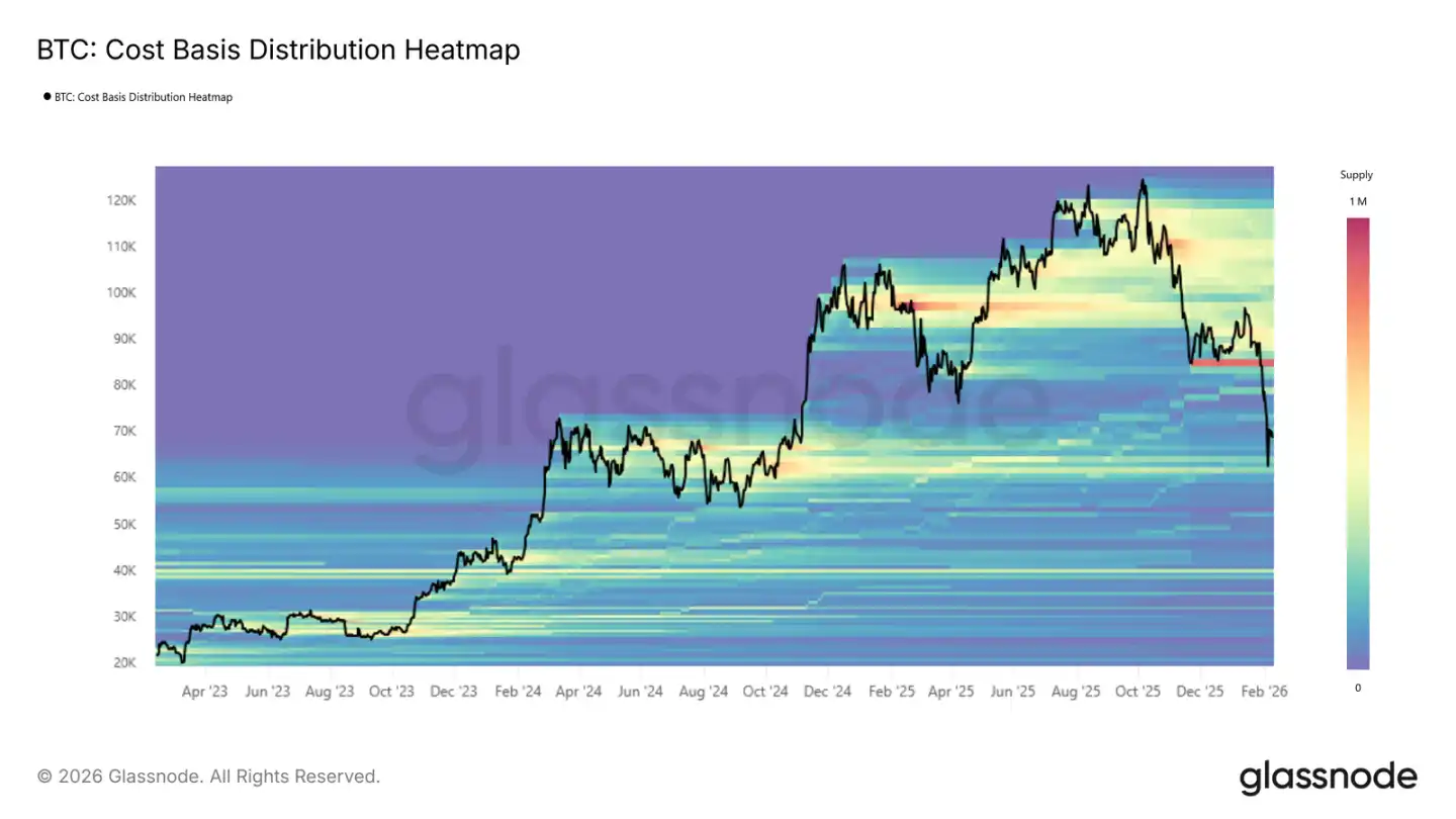 ビットコインは依然として防御構造の中にあり、価格はいくつかの重要なコストラインの間に挟まれている。重要な受け皿エリアは何度もテストされており、6万〜7.2万ドルの範囲では売り圧力が継続している。短期保有者は皆損を抱え、信頼は低い。この状態では、反発はすぐに押し戻されやすく、安定させるには継続的な買い支えが必要だ。