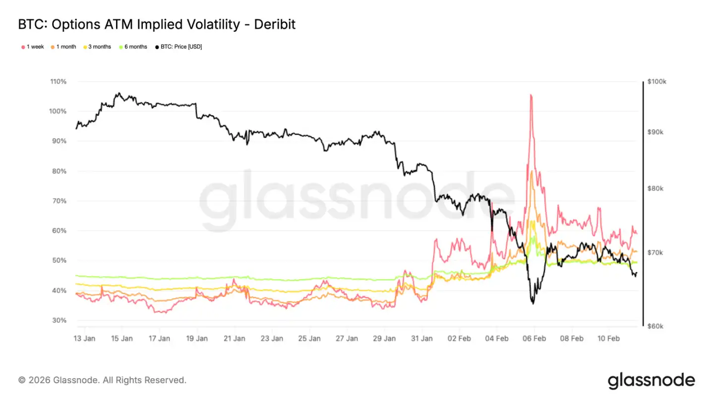 後にやや低下したものの、各期限のボラティリティは高水準を維持しており、市場は不確実性が続くと見ている。