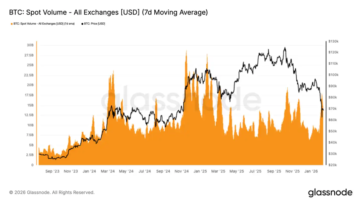 7万ドル付近で現物取引量が一時的に増加したが、これは売り圧力に対する受動的対応であり、積極的な買い増しではない。取引量はすぐに縮小し、買い手の意欲は乏しい。