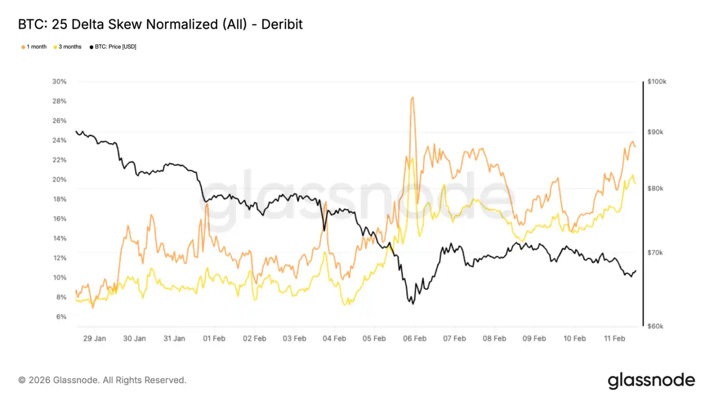 全体的なボラティリティは上昇したが、資金の流れを見るには偏斜度が重要だ。1ヶ月と3ヶ月の25デルタ偏斜度は、下落局面で急激に低下し、プット買いが優勢だったことを示す。