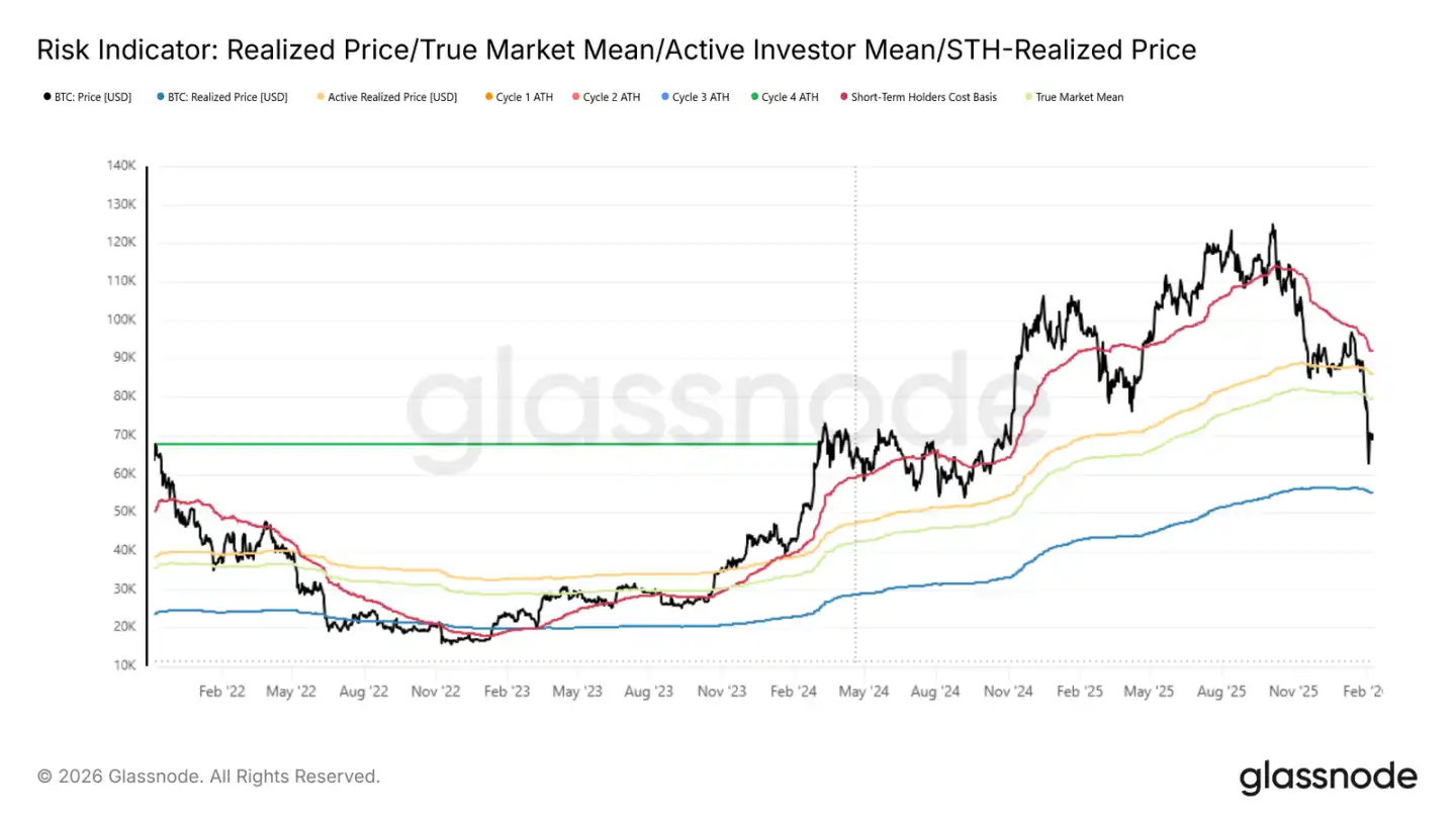 · ビットコインは実市場の平均値(約7.92万ドル)と実現価格(約5.5万ドル)の間に挟まれている。構造の弱化により、市場は常に防御態勢にあり、6万〜7.2万ドルの範囲では売り圧力を受け続けている。